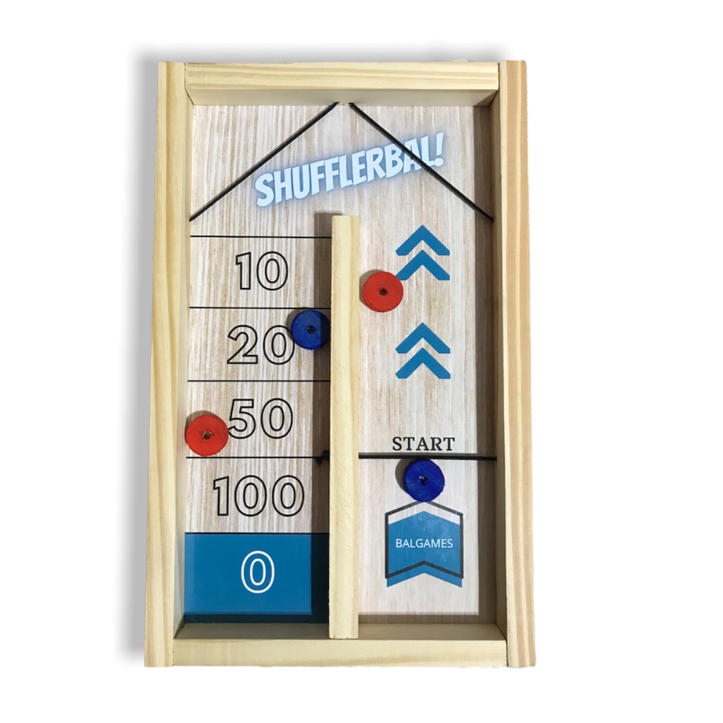 ¡Di adiós al aburrimiento con el Shufflerbal™! Lanza tus discos con la fuerza justa para que reboten en los dos elásticos y se detengan en el área de puntuación de la cancha. ¡Elimina a tus oponentes golpeando sus discos en el área de boxes y sé el campeón indiscutible!